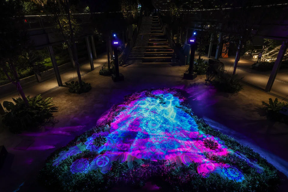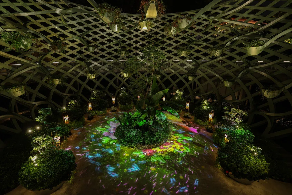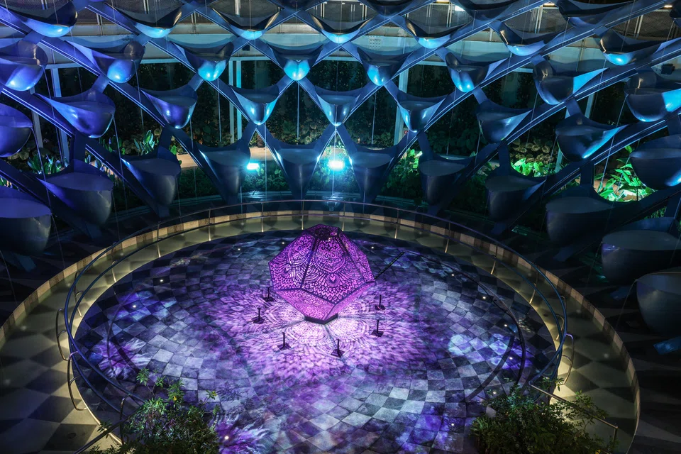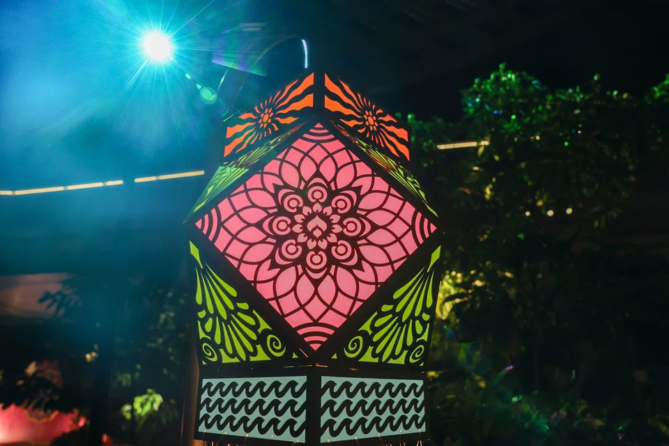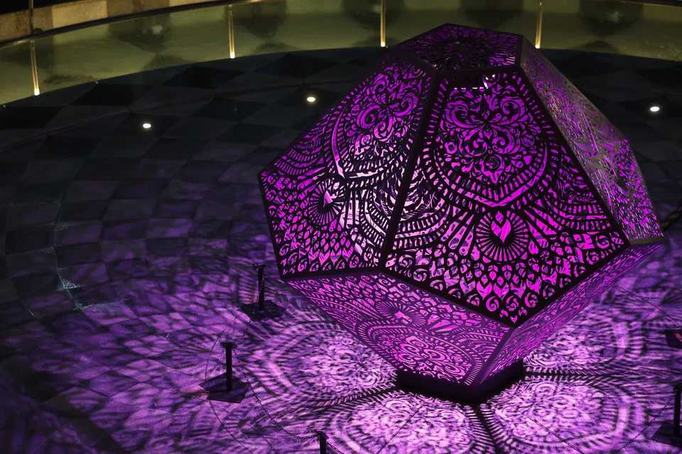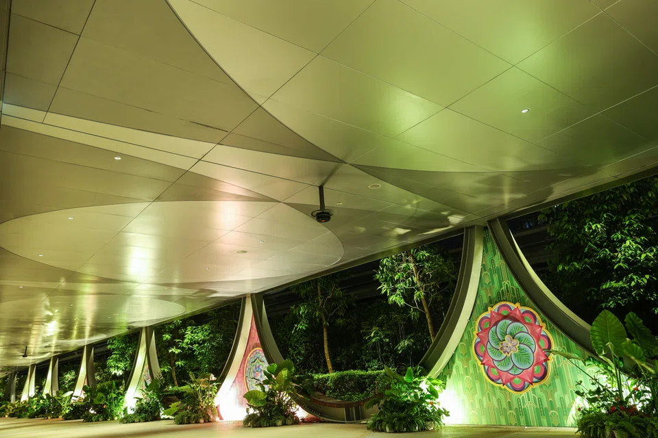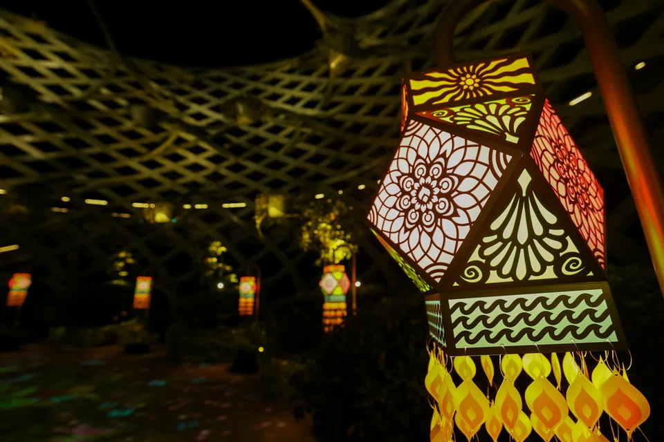சென்சரிஸ்கேப்பின் கட்டடக்கலையை மையமாகக் கொண்டு, சிங்கப்பூர்க் கலைஞர் கிறிஸ் சாய் அந்த மலர்வட்டத்தையும், ‘வான விளக்கு’ என அழைக்கப்படும் பெரிய கூண்டுவிளக்குகளையும் வடிவமைத்துள்ளார். - படம்: த.கவி