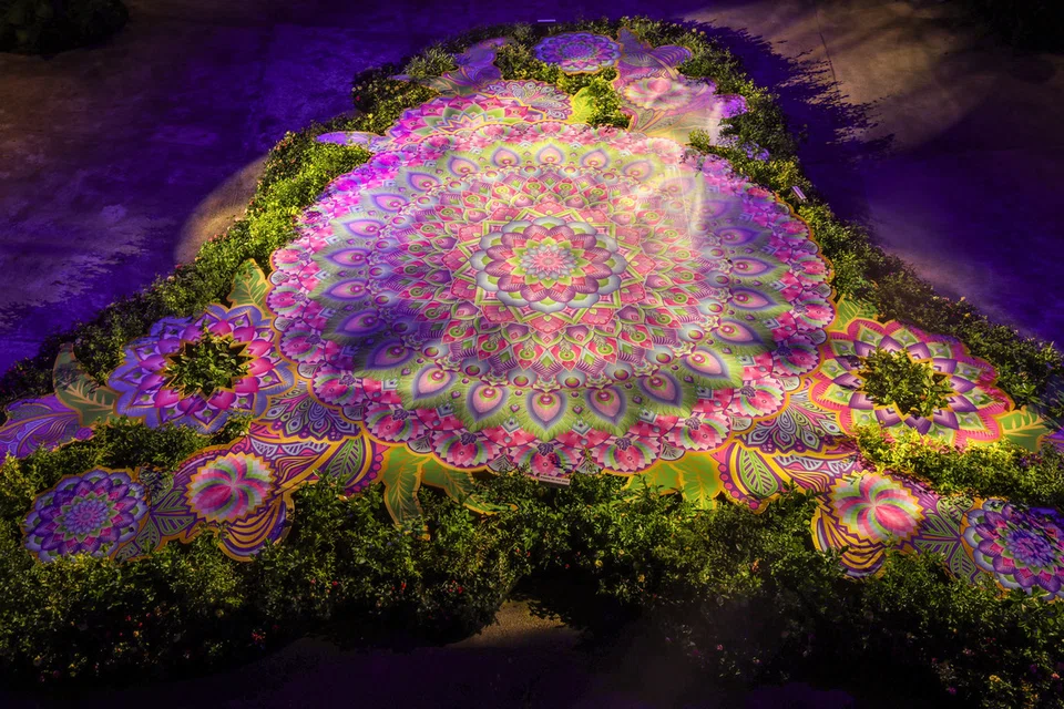 மலர்வட்டத்தின் நுட்பமான, சமச்சீரான வேலைப்பாட்டிற்கு இரவில் வெளிச்சம் சேர்க்கப்படுகிறது. - படம்: த.கவி