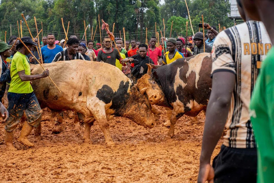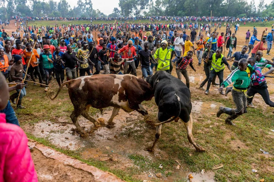 கென்யாவில் அமைந்துள்ள காகாமெகா நகரில் ஆயிரகணக்கான மக்கள் மலின்யா விளையாட்டு அரங்கத்தில் கூடி காளை மாட்டுச்சண்டையுடன் புத்தாண்டை தொடங்கினர். -