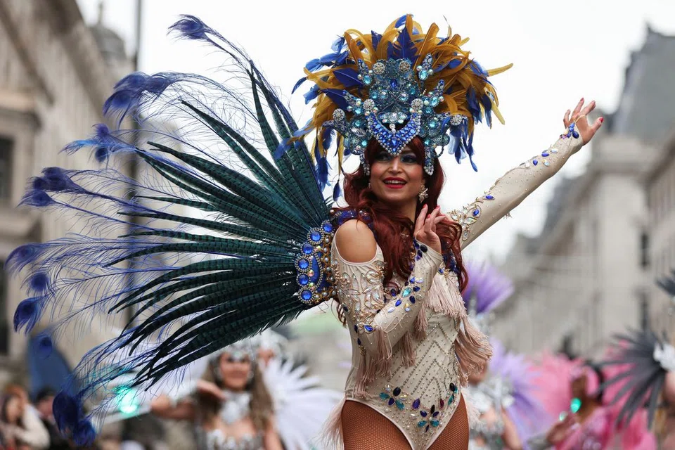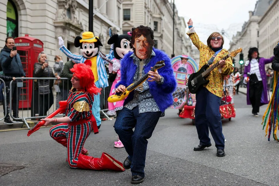 பாடகர் மிக் ஜாகரை பிரதிபலிக்கும் ஒரு முகமூடியை அணிந்துகொண்டு இக்கலைஞர் லண்டனின் புத்தாண்டு கொண்டாட்டங்களில் பங்கேற்றார். -