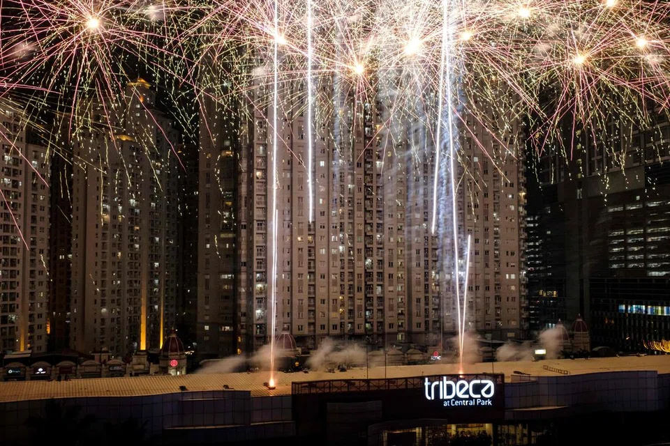 இந்தோனீசியாவின் தலைநகரமான ஜகார்த்தாவில் பேரங்காடியின் கூரைக்கு மேல் வண்ணமிக்க வாணவேடிக்கைக் காட்சியை மக்கள் கண்டுகளித்தனர். -