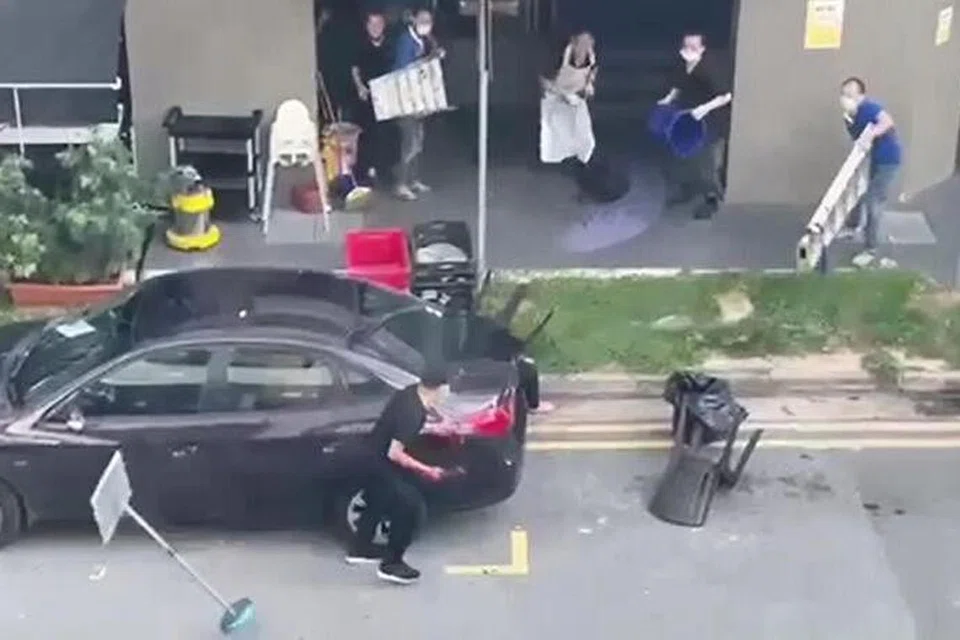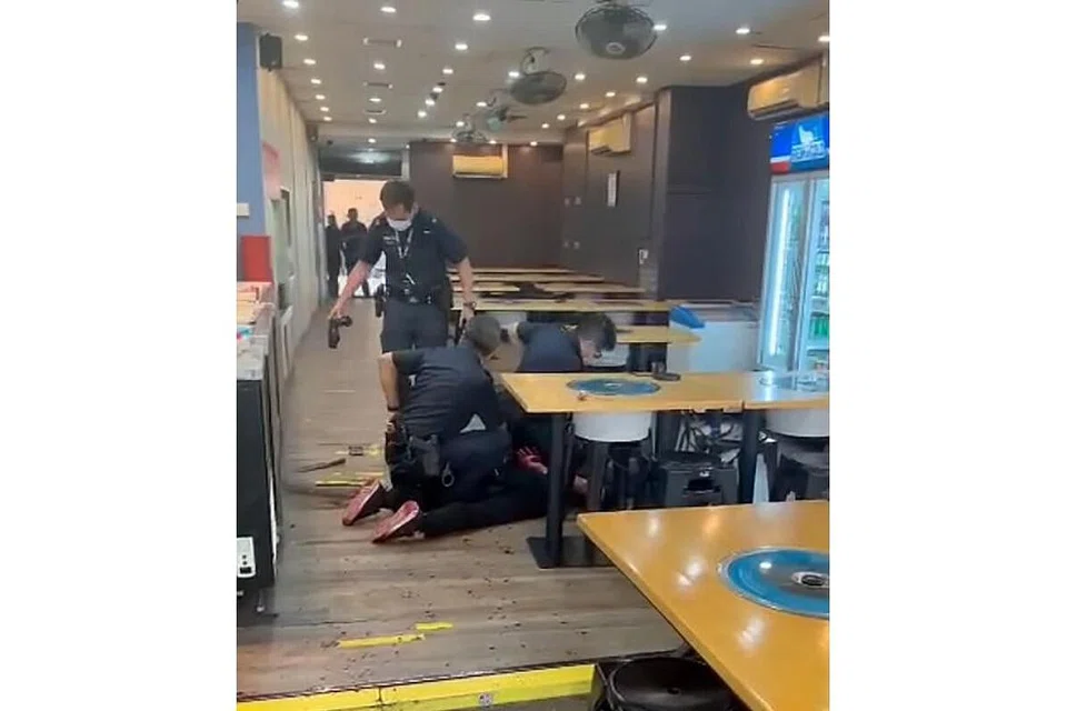 பிளாஸ்டிக் நாள்காலிகள், இரும்பு அறிவிப்புப் பலகைகள், குப்பைத் தொட்டிகள் போன்றவற்றை உணவக ஊழியர்கள் அந்த ஆடவர் மீது வீசினர்.