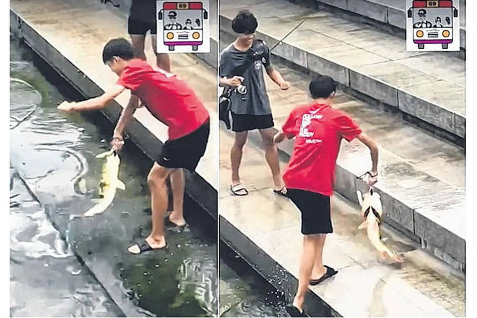 சிவப்பு நிற டி=சட்டை அணிந்த இளையர் ஒருவர் பூங்காவின் நீர் சூழ்ந்த பகுதியின் படிக்கட்டுகளில் நின்று மஞ்சள் நிறத்திலான பெரிய மீன் ஒன்றை நீரிலிருந்து வெளியே இழுப்பதைக் காணொளிப் படம் காட்டியது. படம்: ஃபேஸ்புக்/Sure Boh Singapore