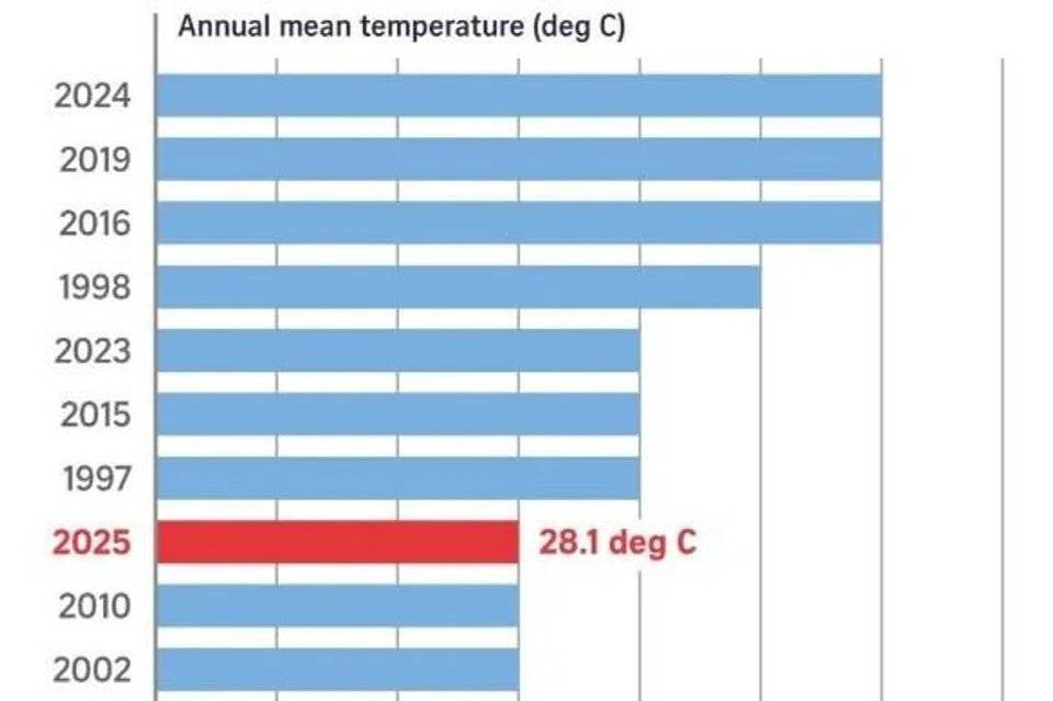 கடந்த ஆண்டில் ‘லா நினா’ வகை பருவநிலை மாற்றம் இந்த வட்டாரத்தில் அதிக மழையைத் தந்தாலும், 2025ஆம் ஆண்டின் சராசரி வெப்பநிலை 28.1 டிகிரி செல்சியஸ் என்று பதிவாகியுள்ளது.