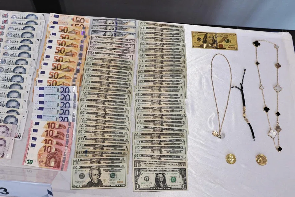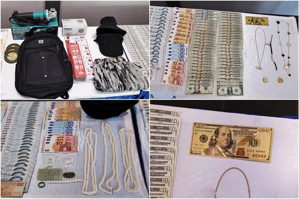 ஒரு கார், இரும்பை அறுக்கும் ரம்பம், நகைகள், $18,000க்கும் அதிகமான மதிப்புக்கொண்ட பல்வேறு நாடுகளைச் சேர்ந்த ரொக்கம் ஆகியவை ஆடவர்களிடமிருந்து பறிமுதல் செய்யப்பட்டன.