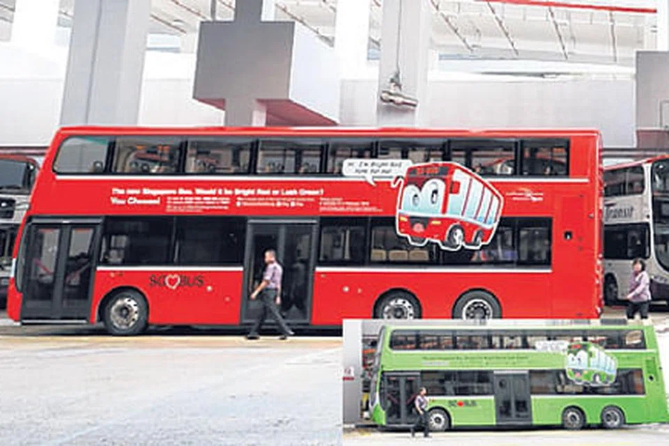 ஜூ கூன் ஒருங்கிணைந்த போக்குவரத்து மையத்தில் நேற்று சிவப்பு, பச்சை வண்ணங்களிலான பேருந்துகள் காட்சிக்கு வைக்கப்பட்டிருந் தன. படம்: ஸ்ட்ரெய்ட்ஸ் டைம்ஸ்