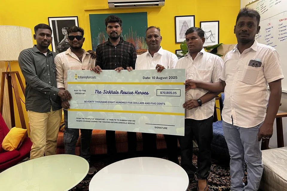 தஞ்சோங் காத்தோங் சாலைப் புதைகுழியில் காருடன் விழுந்த பெண்ணைக் காப்பாற்றிய வெளிநாட்டு ஊழியர்கள் எழுவருக்கு $70,805.05 மதிப்பிலான மாதிரிக் காசோலையை ஆகஸ்ட் 10ஆம் தேதி, ‘இட்ஸ்ரெய்னிங்ரெய்ன்கோட்ஸ்’ அறநிறுவனம் வழங்கியது.
