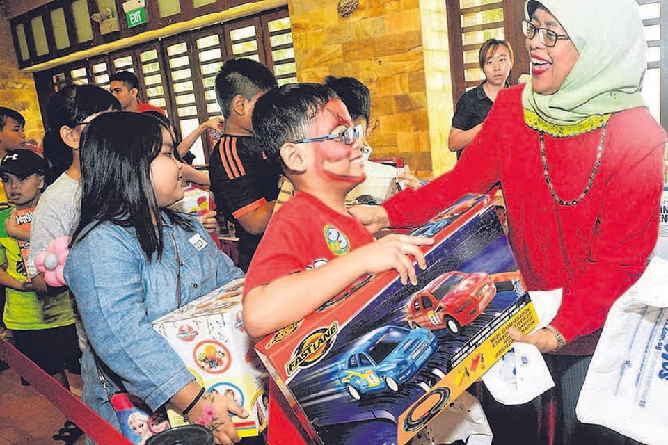 சிறுவர்களுக்கு விளையாட்டுப் பொருட்களை கிறிஸ்துமஸ் பரிசுகளாக வழங்குகிறார் நாடாளுமன்ற நாயகர் ஹலிமா யாக்கோப் (வலது). படம்: பெரித்தா ஹரியான்
