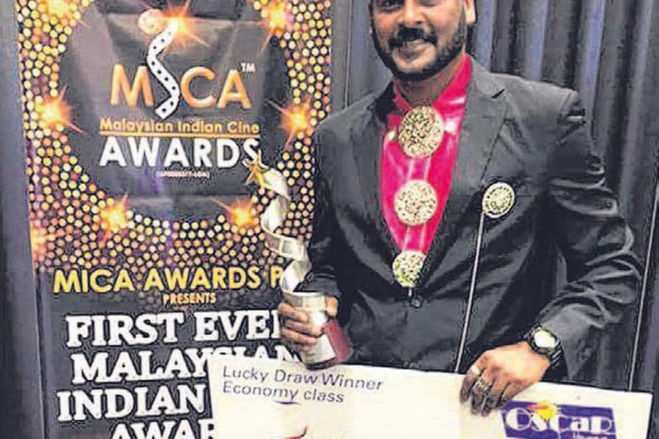 மலேசியாவின் ஷா ஆலம் நகரில் கடந்த வெள்ளிக்கிழமை அன்று முதன் முறையாக நடந்தேறிய மலேசிய இந்திய திரைப்பட விருது நிகழ்ச்சியில் 'சிறந்த நகைச்சுவை நடிகர்' விருதை வென்ற உள்ளூர் நடனக் கலைஞர் ரமேஷ்வரா. படம்: ரமேஷ்வரா
