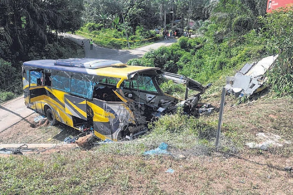 முவார் அருகே, கம்புங் ஜயோரில் 10மீ. பள்ளத்தில் விழுந்து சிதைந்துவிட்ட பேருந்து. படம்: தி ஸ்டார்