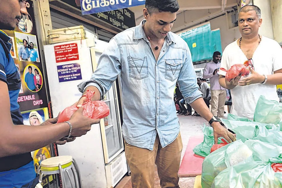 கடந்த ஞாயிற்றுக்கிழமை கிறிஸ்துமஸ் தினத்தன்று லிட்டில் இந்தியா பகுதியில் வெளிநாட்டு ஊழியர் ஒருவர் பிரியாணி கடை நடத்தும் முத்துசாமியிடமிருந்து உணவுப் பொட்டலத்தைப் பெற்றார். (வலக்கோடி) பிரியாணி தானத்திற்கு ஏற்பாடு செய்த பாலா. படம்: ஸ்ட்ரெய்ட்ஸ் டைம்ஸ்