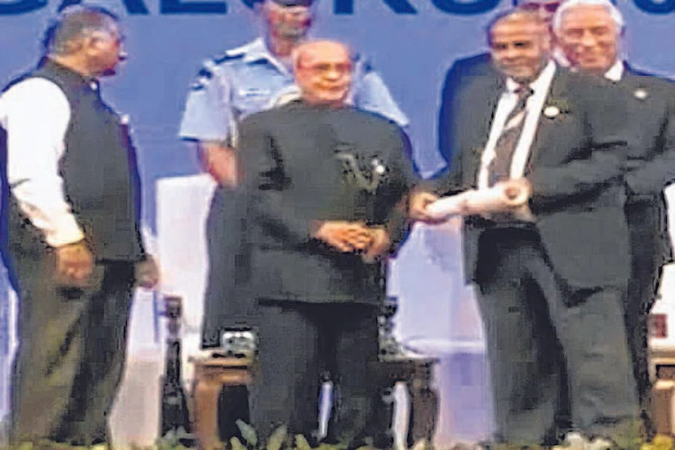 சிங்கப்பூர் இந்தியர் சங்கத்தின் தலைவர் திரு கே. கேசவபாணி (வலது) இந்திய அதிபர் பிரணாப் முகர்ஜியிடமிருந்து 'பிரவாசி பாரதிய சமான்' விருதைப் பெற்றுக்கொள்கிறார். படம்: ஃபேஸ்புக்