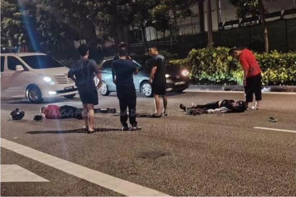 தலைக்கவசம் அணிந்திருந்த மற்றொருவரும் சாலையில் விழுந்து கிடந்தார். அங்கிருந்த மற்ற வாகனவோட்டிகள் அவ்விருவருக்கு உதவ முற்பட்டனர்.