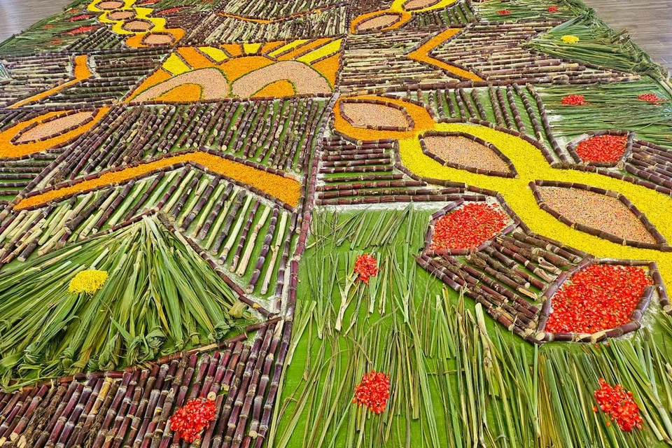 கரும்புக் கோலத்தை வடிவமைத்து அதன் உருவாக்கத்தை வழிநடத்திய திருவாட்டி விஜயா மோகன், சூரியனைக் குறிப்பிடும் விதமாக மஞ்சள், ஆரஞ்சு நிற பூக்களைப் பயன்படுத்தியதாகக் கூறினார்.