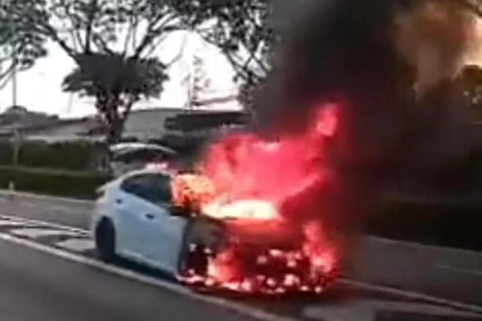 ‘எஸ்ஜி ரோட் விஜிலான்டெ’ ஃபேஸ்புக் பக்கத்தில் பதிவேற்றப்பட்டுள்ள காணொளியில் வெள்ளை காரின் முன்பகுதி தீப்பற்றி எரிவதைக் காணமுடிகிறது.