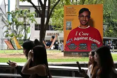 மோசடிக் குற்றங்கள் தொடர்பாகப் பொதுமக்களுக்கு எச்சரிக்கை விடுக்கும் வகையில் சிங்கப்பூரில் ஆங்காங்கே காவல்துறை அறிவிப்புப் பதாகைகளை வைத்துள்ளது. - படம்: ஸ்ட்ரெய்ட்ஸ் டைம்ஸ்