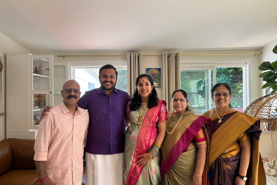 “இங்கு பலகாரங்கள் விற்கும் கடைகள் இருந்தாலும் வீட்டில் பலகாரம் செய்வதுதான் தீபாவளி உணர்வைத் தருகிறது. இங்கே முறுக்கு மாவு கிடையாது. எல்லாவற்றையும் அடிப்படையில் இருந்து செய்யவேண்டும்,” என சென்ற ஆண்டு தாங்கள் தலைத் தீபாவளி கொண்டாடியதை நினைவுகூர்ந்தனர் தம்பதியர்.