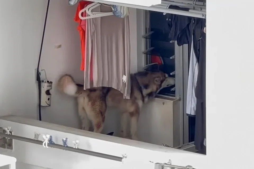 ‘அலாஸ்கன் மாலமியூட்’ வகையைச் சேர்ந்த அந்த நாய், 35வது தளத்திலுள்ள வீட்டின் சமையலறைக்குப் பின்புறம் அமைந்துள்ள மேல்மாடத்தில் மிகவும் ஆபத்தான முறையில் அடைத்து வைக்கப்பட்டிருந்தது.