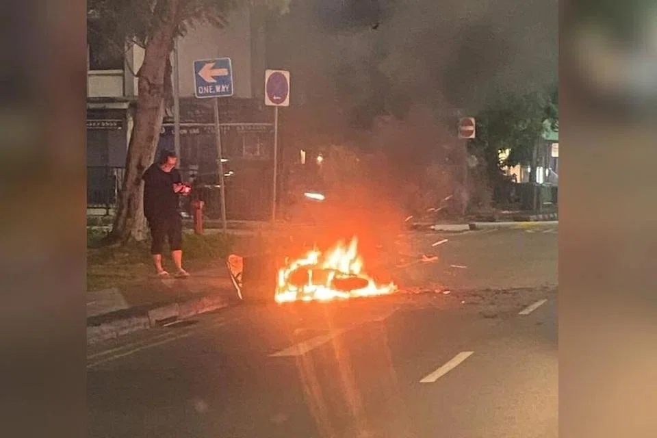 பாலஸ்டியர் சாலையில் ஞாயிற்றுக்கிழமை (மார்ச் 22) அதிகாலை நேரத்தில் மின்சைக்கிள் ஒன்று திடீரென தீப்பிடித்தது.
