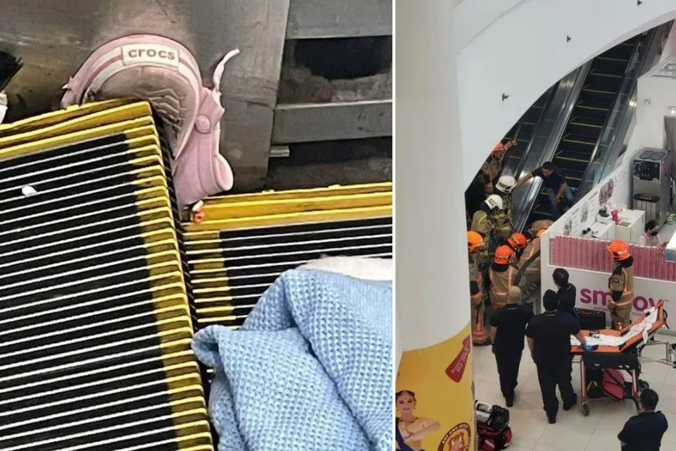 மின்படிகளில் அடிக்கடி சிக்கக்கூடியதாகக் கூறப்படும் ‘கரோக்ஸ்’ ரப்பர் காலணிகளைச் சிறுமி அணிந்திருந்ததாகக் கூறப்படுகிறது.