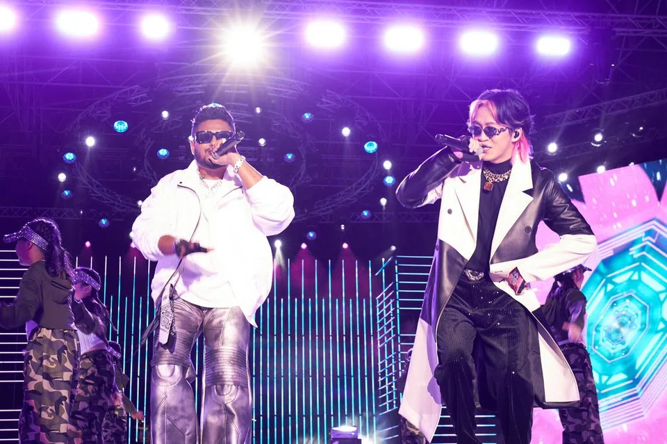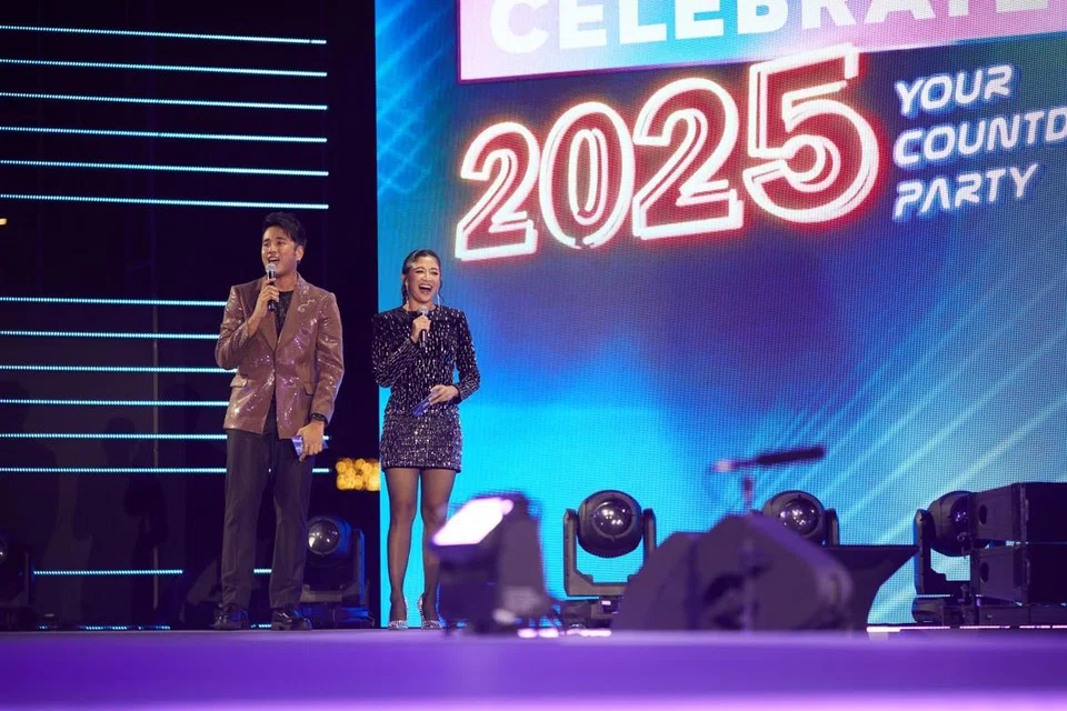 மீடியாகார்ப் கலைஞர்களான ஹோக்கிம் கோமஸ், முனா பக்ஹரிப் நிகழ்ச்சி நெறியாளர்களாக மக்களை குதூகலப்படுத்தி புத்தாண்டு உணர்வை மெருகூட்டினர்.  - படம்: மீடியாகார்ப்