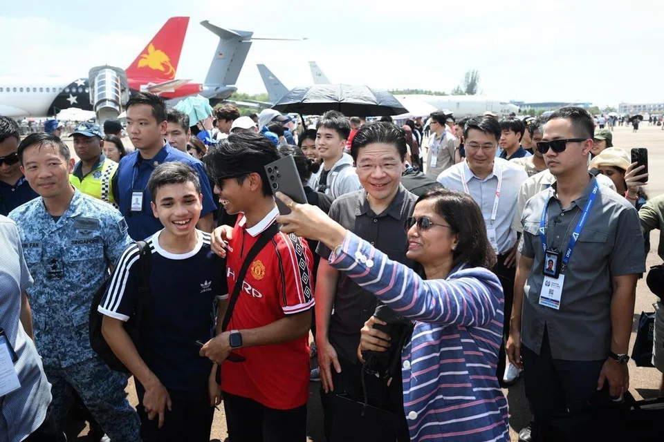 விமானக் கண்காட்சியில் பிரதமர் லாரன்ஸ் வோங்குடன் படமெடுத்துக் கொண்ட பொதுமக்கள். - படம்: ஸ்ட்ரெய்ட்ஸ் டைம்ஸ்