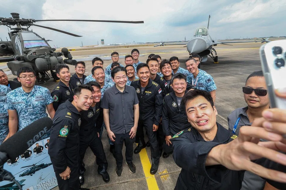 சிங்கப்பூர் குடியரசு ஆகாயப்படை விமான சாகசக் காட்சிக் குழுவுடன் பிரதமர் லாரன்ஸ் வோங். - படம்: எம்டிடிஐ