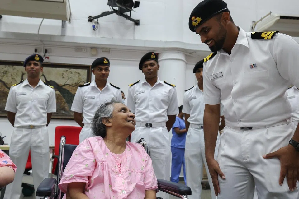 ஸ்ரீ நாராயண மிஷன் மூத்தோருடன் உரையாடும் இந்தியக் கடற்படை வீரரான லெப்டினென்ட் ரா நி‌‌‌ஷாந்த். - படம்: த. கவி