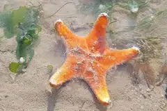 ஆழமில்லா நீரில் மீனின் முகம் மட்டுமே மணலிலிருந்து வெளியே தெரிவதாகக் காணொளி உள்ளது.