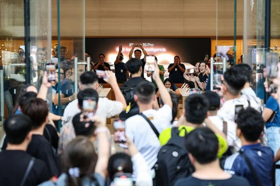 ஆர்ச்சர்ட் ரோட்டில் அமைந்துள்ள ஆப்பிள் நிறுவனக் கடையில் செப்டம்பர் 20ஆம் தேதி, வாடிக்கையாளர்களின் மகிழ்ச்சி ஆரவாரத்துக்கிடையே புதிய ஐஃபோன் 16 விற்பனை தொடங்கியுள்ளது.