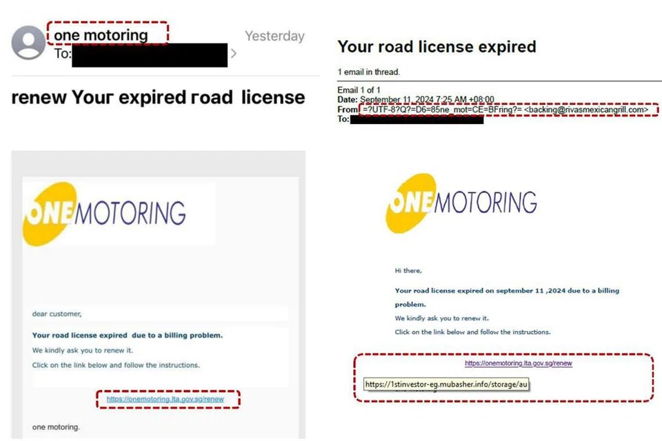 They received e-mails from a sender pretending to be OneMotoring by the Land Transport Authority (LTA), informing them that their vehicles’ road tax or road licence was expiring, the police said.