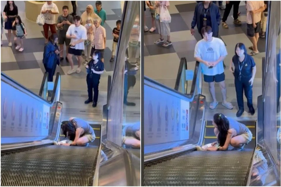 சம்பவம் தொடர்பில் ஃபேஸ்புக் பக்கத்தில் வெளியான காணொளியில், மின்படியில் பாதம் சிக்கிய நிலையில் சிறுமி ஒருவர் இருப்பதையும் அவருக்கு அருகே பெண் ஒருவர் அமர்ந்திருப்பதையும் காண முடிந்தது.