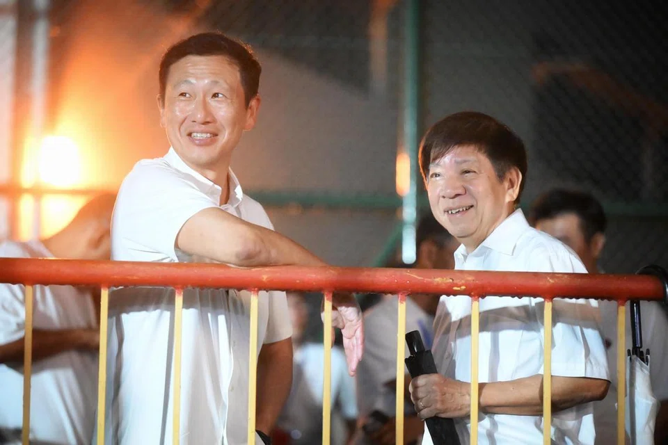 எவர்கிரீன் தொடக்கப்பள்ளியில் மசெக பிரசாரக் கூட்டத்தில் சுகாதார அமைச்சர் ஓங் யி காங்கும் முன்னாள் அமைச்சர் கோ பூன் வானும். - படம்: ஸ்ட்ரெய்ட்ஸ் டைம்ஸ்