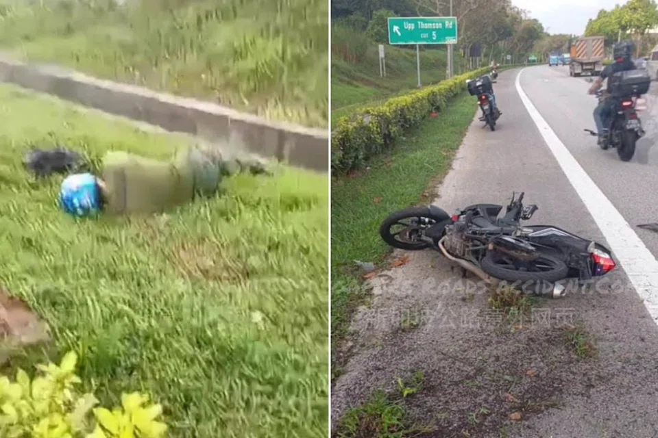 மோட்டர்சைக்கிள் ஓட்டுநர் ஒருவர் விரைவுச்சாலையின் அருகே இருக்கும் புல் தரையில் படுத்திருப்பதையும் அவருக்கு அருகே விரைவுச்சாலையில் மோட்டர்சைக்கிள் ஒன்று விழுந்து கிடப்பதையும் ‘Singapore Roads accident.com’ எனும் ஃபேஸ்புக் பக்கத்தில் பதிவிடப்பட்ட காணொளியில் காண முடிந்தது.