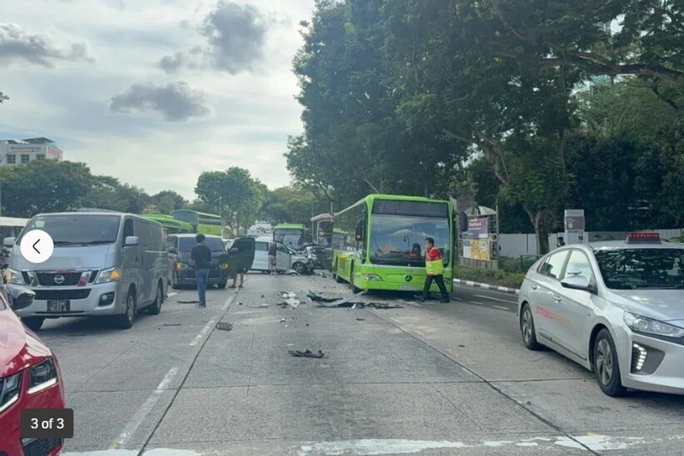 சாலையின் இடது தடத்தில் கோ-அஹெட் சிங்கப்பூர் பேருந்து ஒன்று நிறுத்தப்பட்டிருந்தது. அதன் அருகில் கருப்பு நிற கார் ஒன்று காணப்பட்டது. அதன் முன்பகுதி சேதமுற்றிருந்தது.