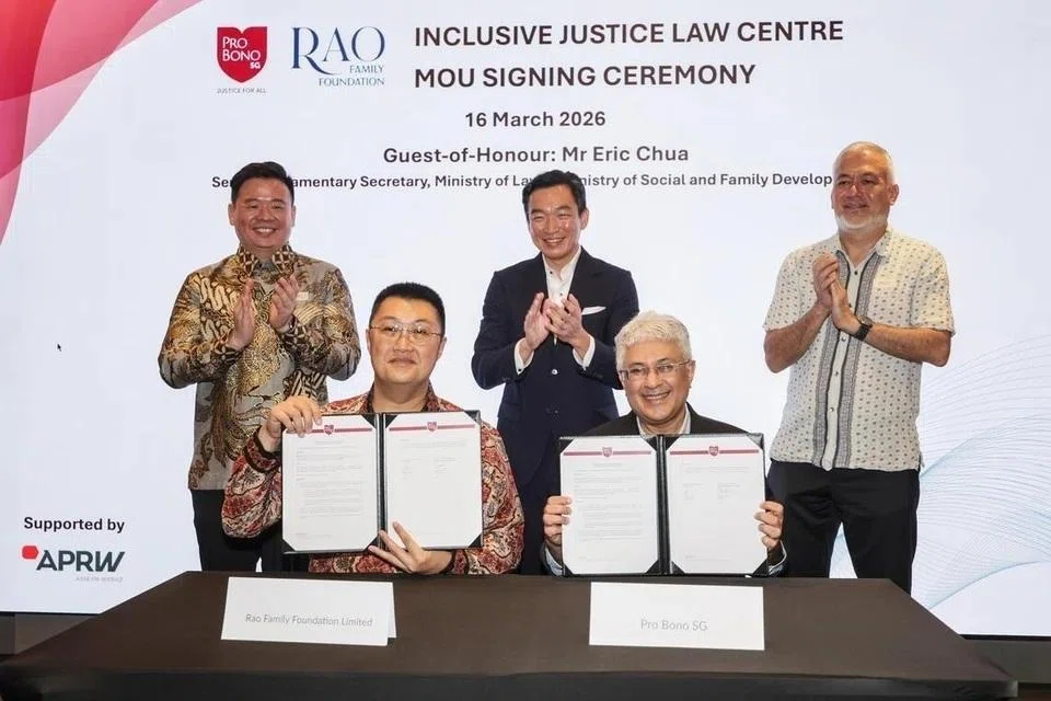 த ஃபவுண்டரி சமூக மையத்தில் திங்கட்கிழமை (மார்ச் 16) இந்த மையத்திற்கான புரிந்துணர்வு ஒப்பந்தத்தில் புரோ போனோ எஸ்ஜி, ராவ் குடும்ப அறநிறுவனம் ஆகியவை கையெழுத்திட்டன.