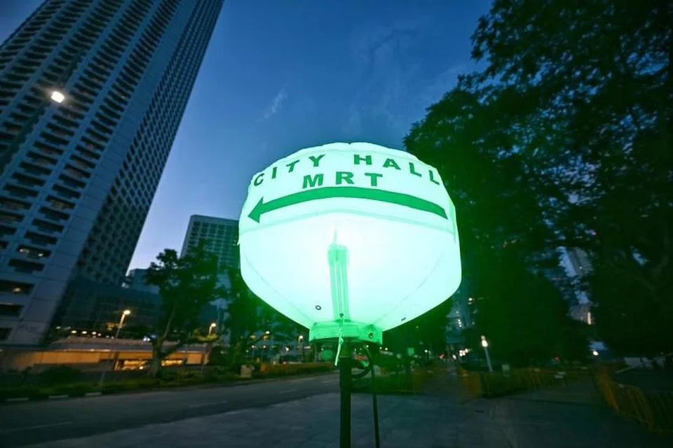 பொதுமக்களுக்கு அருகிலுள்ள ரயில் நிலையங்களுக்கு வழிகாட்ட உதவும் வகையில் ஒளியூட்டப்பட்ட இரண்டு பலூன்கள் ராஃபிள்ஸ் சிட்டி சென்டருக்கு அருகில் அமைக்கப்பட்டிருக்கும்.
