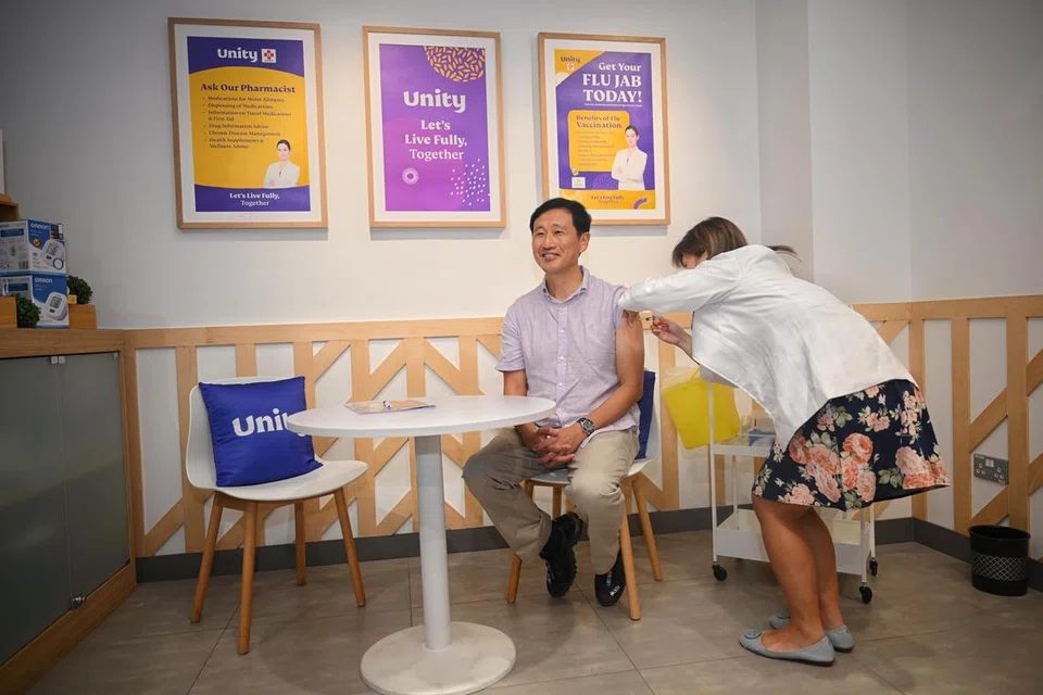பார்க்வே பரேட் கடைத்தொகுதியில் உள்ள யூனிட்டி மருந்தகத்தில் அக்டோபர் 28ஆம் தேதி சுகாதார அமைச்சர் ஓங் யி காங் சளிக்கான தடுப்பூசியை போட்டுக் கொண்டார். - படம்: ஸ்ட்ரெய்ட்ஸ் டைம்ஸ்