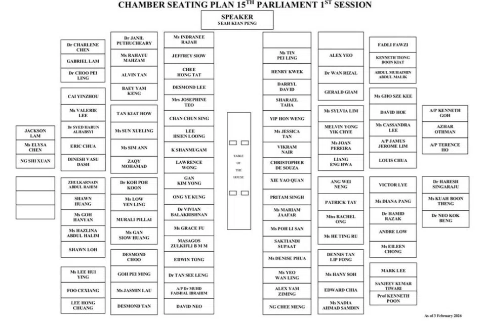 செவ்வாய்க்கிழமை (பிப்ரவரி 3) நாடாளுமன்ற அமர்வுக்குமுன் காலை 10.30 மணியளவில் எந்த உறுப்பினர் எங்கு அமர்வார் என்பதைக் காட்டும் வரைபடத்தை நாடாளுமன்றம் வெளியிட்டது.