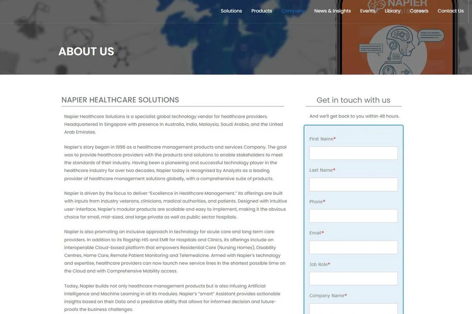 நேப்பியர் ஹெல்த்கேர் சல்யூஷன்ஸ் 2008ஆம் ஆண்டு தொடங்கப்பட்டது. அதன் ஊழியர்களில் பெரும்பாலோர் இந்தியாவின் ஹைதராபாத் நகரில் செயல்படுவதாக லிங்க்ட்டின் சமூக ஊடகப் பக்கத்தில் தெரிய வந்துள்ளது.