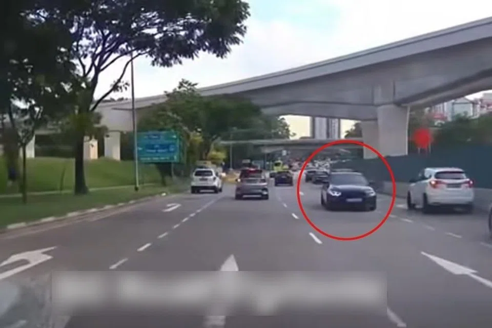 தீவு விரைவுச்சாலையை நோக்கிய வலப்புறப் பாதையில், வாகனங்கள் வரிசையாக நிற்பது காணப்பட்டது. அந்த பிஎம்டபிள்யூ கார் கடந்துசென்றபோது, பல வாகனங்கள் சிறிது நேரம் நிற்பதும் தெரிகிறது.