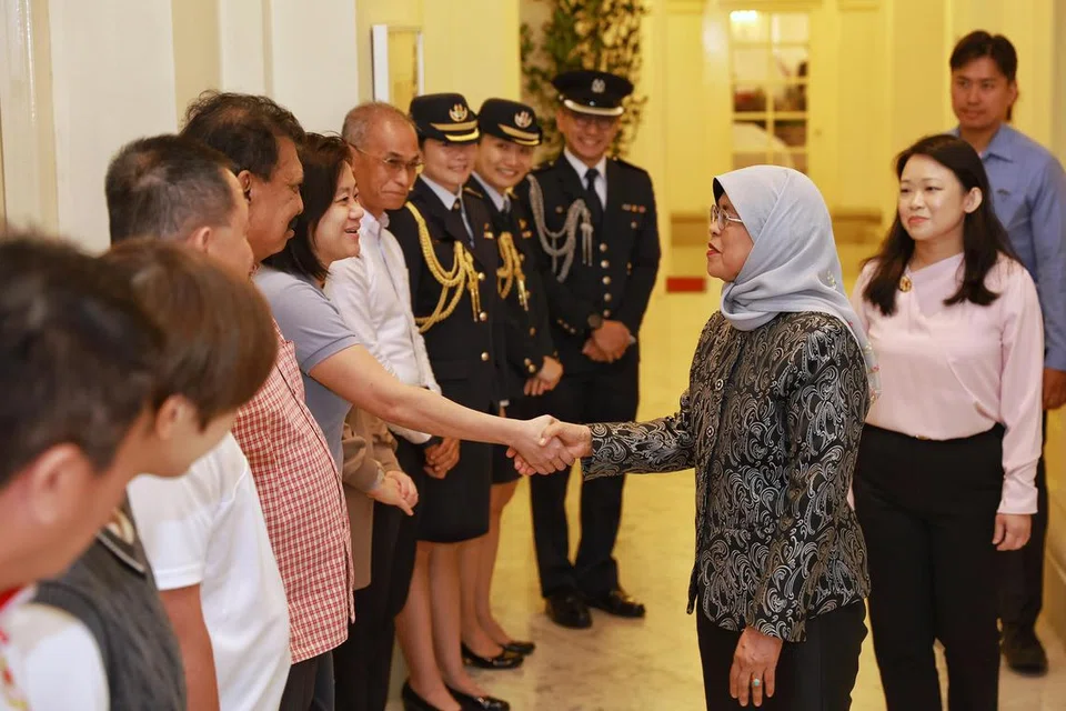 திருவாட்டி ஹலிமா, 69, இஸ்தானாவில் உள்ள மாடிப்படியில் குழுப் புகைப்படம் எடுப்பதற்கு முன், ஊழியர்களுடன் கைக்குலுக்கிப் பேசினார்.