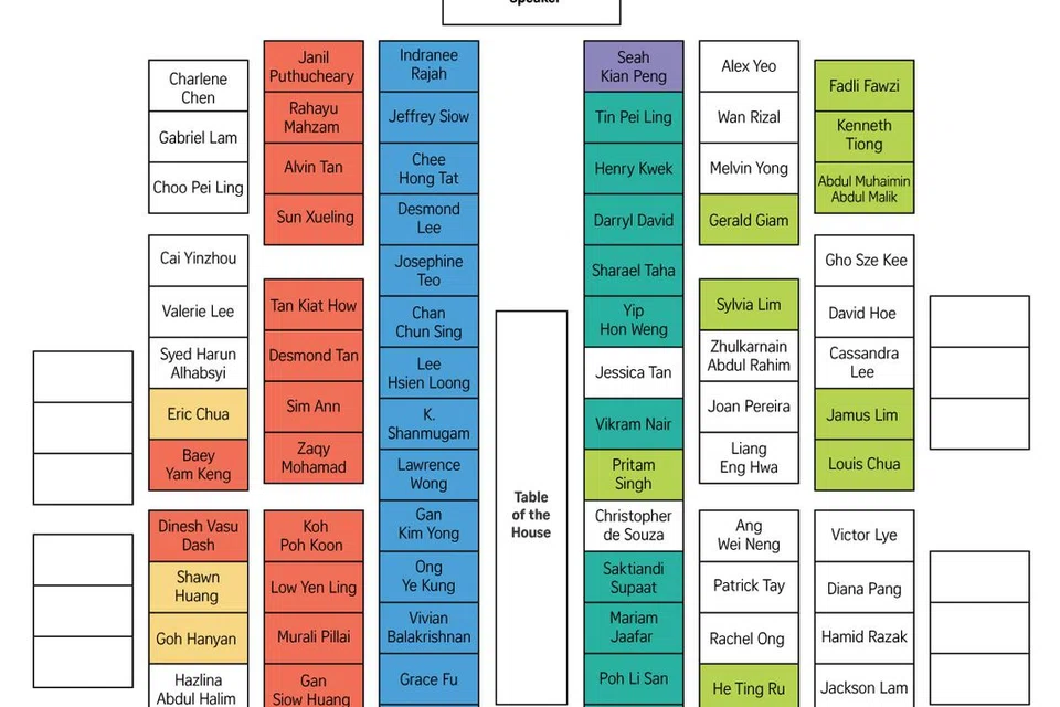 சிங்கப்பூர் நாடாளுமன்றம் அதன் உறுப்பினர்கள் அமரும் இருக்கை விவரங்களை வெளியிட்டுள்ளது.