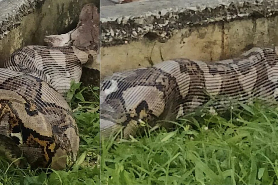 ஃபேஸ்புக்கில் பகிரப்பட்ட படங்கள், புல்வெளிக்குப் பக்கத்தில் உள்ள திறந்தவெளி வடிகாலுக்கு உள்ளே அந்த மலைப்பாம்பின் ஒரு பகுதி காணப்பட்டது. அதன் வயிறு உப்பியிருந்தது தெரிந்தது.