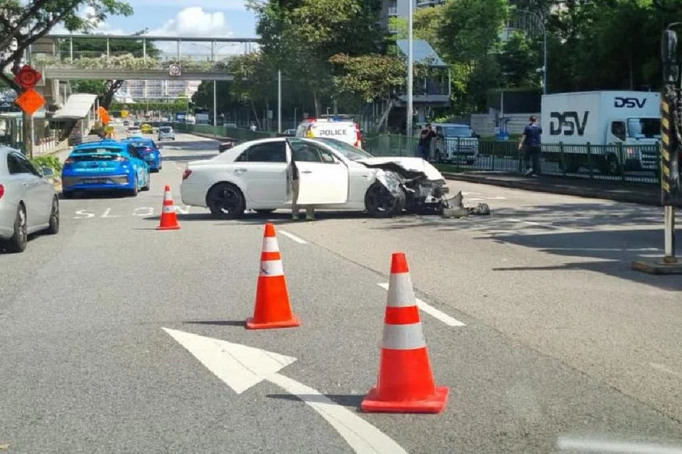 விபத்து காரணமாக வெள்ளை நிற கார் ஒன்று சேதமடைந்தது. மூன்று சாலைத் தடங்களைக் கொண்ட பார்ட்லி சாலையில் அந்த கார் கிடந்தது. - படம்: சாவ்பாவ் வாசகர்