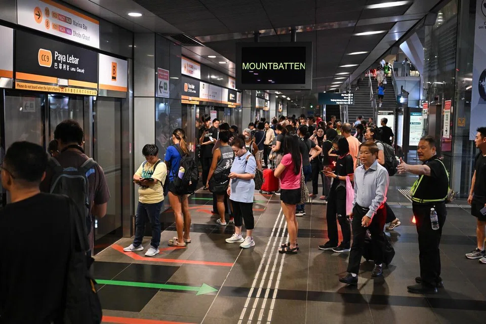 பாயார் லேபா ரயில் நிலையத்தில் சனிக்கிழமை (ஜனவரி 17)  காலை 8.30 மணிக்குத் திரண்டுள்ள கூட்டத்தினருக்கு நிலையப் பணியாளர்கள் வழிகாட்டினர். - படம் ஸ்ட்ரெய்ட்ஸ் டைம்ஸ்
