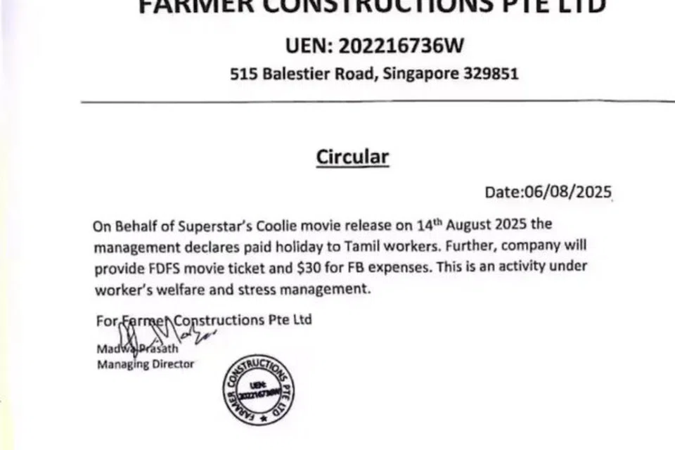 சிங்கப்பூரில் உள்ள கட்டுமான நிறுவனம் ஒன்று ரஜினியின் ‘கூலி’ படத்தைக் காண தனது தமிழ் ஊழியர்களுக்கு சம்பளத்துடன் கூடிய விடுப்பு வழங்குவதாக அறிவித்து உள்ளது.