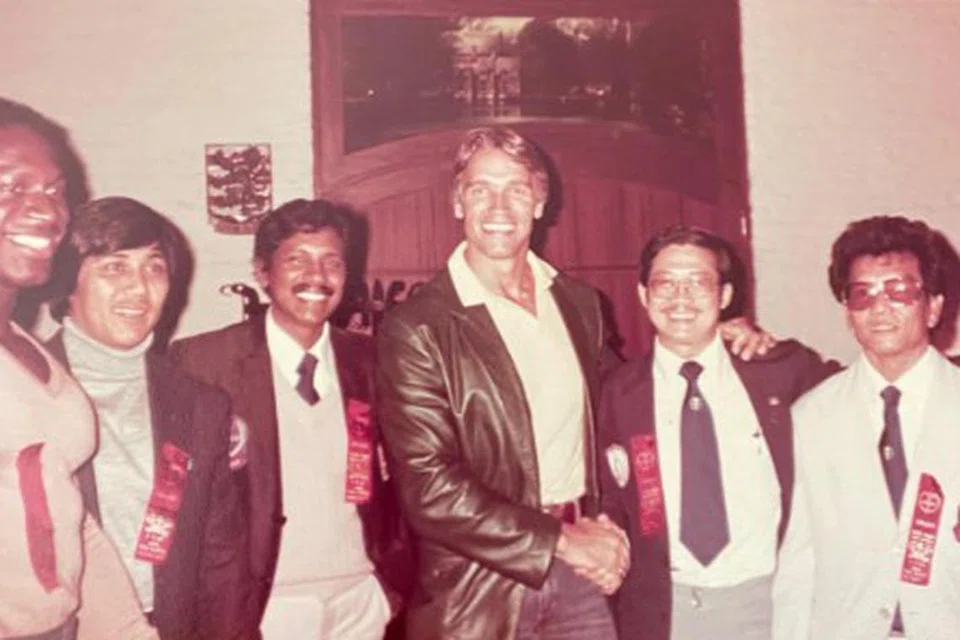 பிரபல உடற்கட்டு வீரரும் ஹாலிவுட் நடிகருமான ஆர்னல்ட் சுவாஸனேகர் எம் லெட்சுமணன். 1987ல் பெல்ஜியம் உலக உடற்கட்டு ஒலிம்பிக் போட்டியில் எடுக்கப்பட்ட படம்.  - படம்: எம் லெட்சுமணன்