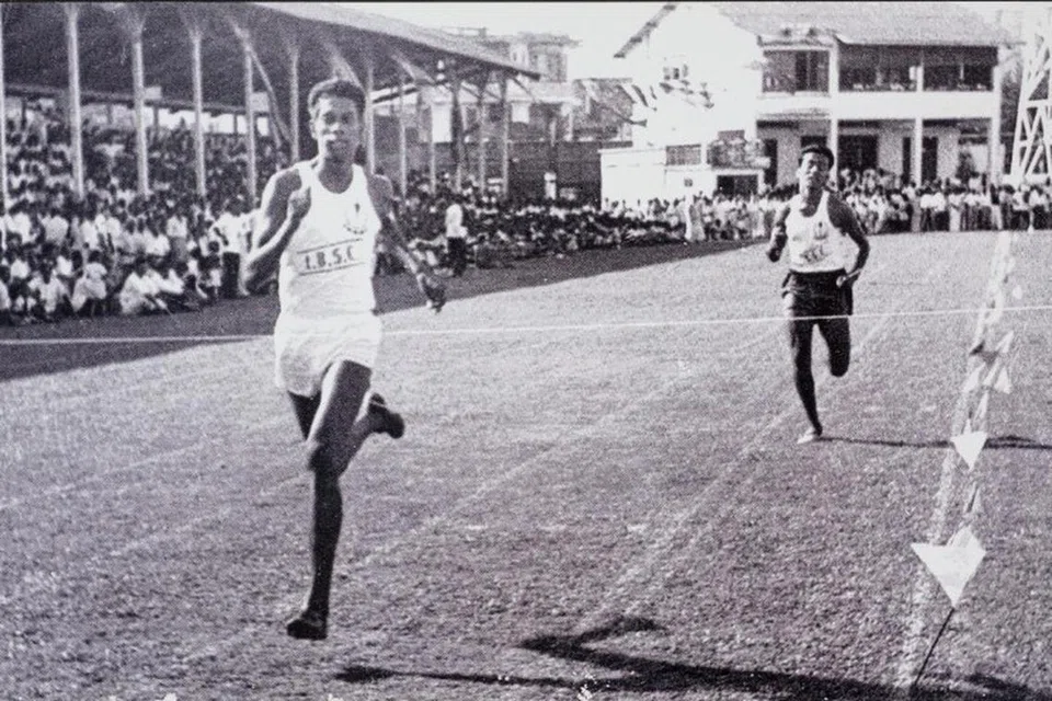 1957ல் ஜாலான் புசார் விளையாட்டரங்கில் முன்னாள் திடல்தட வீரர் ஜெயராம் ரங்கசாமி (இடது). பிற்காலத்தில் அவர், சிங்கப்பூரின் தமிழர் இயக்கத்தின் தலைவராகத் திகழ்ந்தார்.  - படம்: ரூட்ஸ்.எஸ்ஜி, இந்தியர் மரபுடைமை நிலையம்