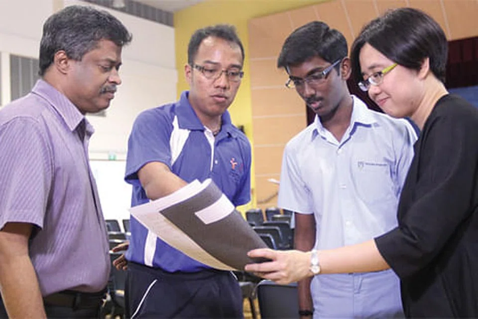 (இடமிருந்து) தமது தமிழாசிரியர் திரு த. திருமாறன், ஆசிரியர் திரு ரூடி இரவான், உட்லண்ட்ஸ் உயர்நிலைப் பள்ளி பள்ளி முதல்வர் திருவாட்டி டான் கெ ஸின் ஆகியோருடன் மாணவர் ம. தினேஷ் பழனி (இடமிருந்து 3வது). படம்: திமத்தி டேவிட்